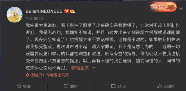 明星屏摄不是没有先例,此前乃万也发了一条带有屏摄live图片的微博,经评论区提醒之后马上删除并且发文道了歉。去年9月,范冰冰担任圣塞巴斯蒂安国际电影节评委时,也将正在放映的电影屏摄照发到了微博,被评论区指出后,她编辑了微博,隐藏了屏摄的图片。