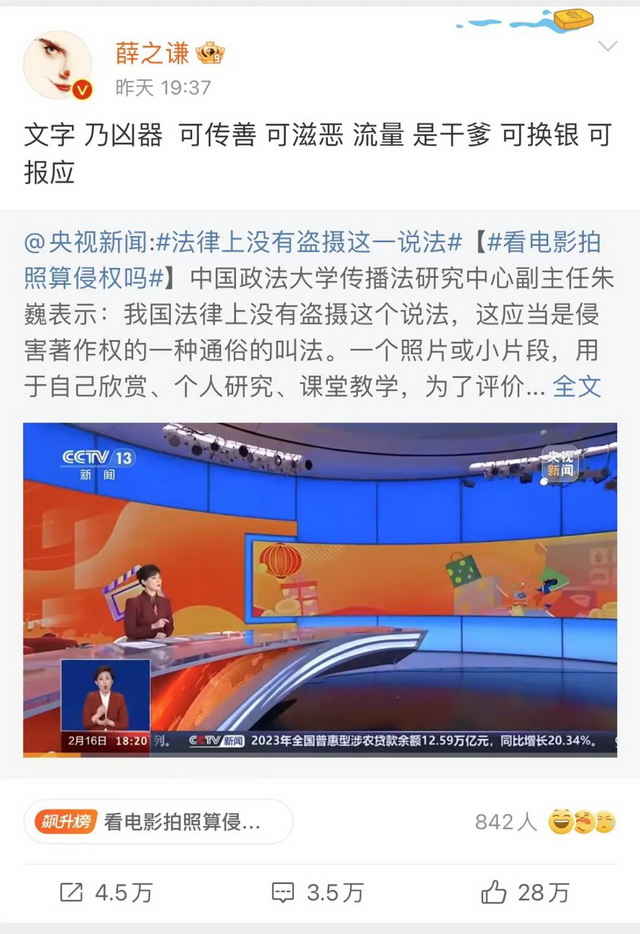 随后薛之谦转发了微博,将事件进一步推向高潮:粉丝带着“法律上没有盗摄这一说法”的词条集体“为爱冲锋”,甚至还开始跟风晒屏摄图,将本应是严肃的行业话题,扭曲为一场看似对错模糊的粉黑大战。