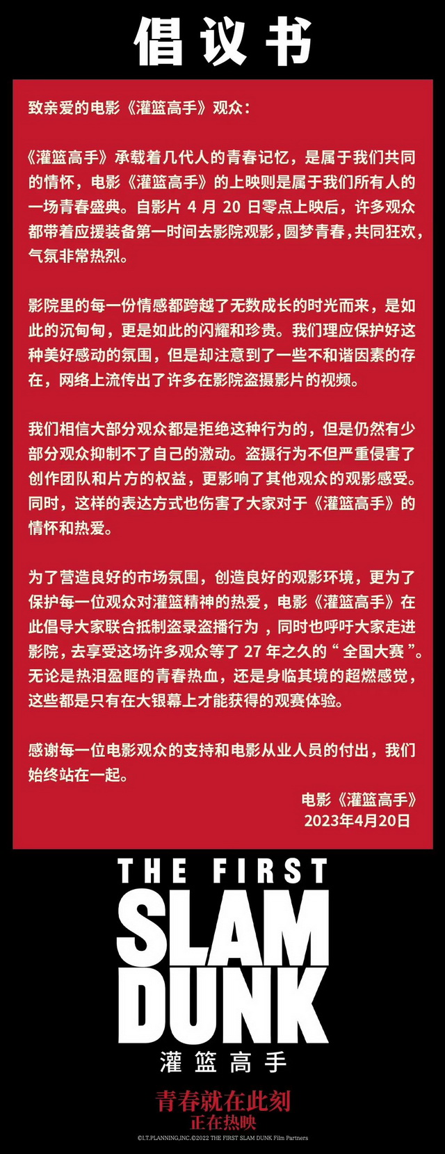另外,粉丝文化的流行,也在一定程度上影响了大众看待屏摄的态度。《灌篮高手》在国内上映时,由于粉丝属性较强,屏摄行为更加严重,为此,官方特地发布了倡议书,号召观众拒绝盗摄;《少年的你》《无名》等有流量明星参演的影片上映时,官方也都发布了拒绝盗摄的倡议。
