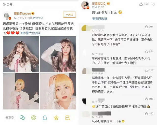 另外,选择什么类型的真人秀,也是一门学问,这是很考验明星及其团队的问题。比起其他综艺,能全方位展现明星性格的真人秀,无疑更依赖本人与节目相性的适配程度。谭松韵参加《明星大侦探》后,因为表现不好遭遇口碑滑铁卢,再次去录《我是大侦探》时,王紫璇在宣传微博下留言安慰她,“要玩那么好干什么。”遭到一众网友反对:“玩不好你来干什么?”