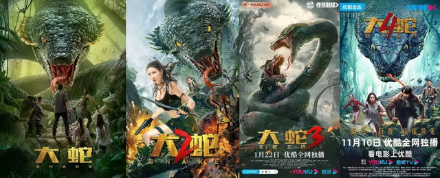 在网络电影市场,也有一些原创IP的系列电影案例,如《大蛇》系列、《暴走财神》系列、《二龙湖》系列等等。但碍于口碑因素,这些系列没能破圈,票房表现也跟随着大盘表现而持续疲软,品牌效应失效。以《大蛇》系列为例,从2018年到现在更新了4部,分账票房分别为5078.4万、3256.7万、3742.2万、2077.4万,豆瓣评分稳定在5分以下。