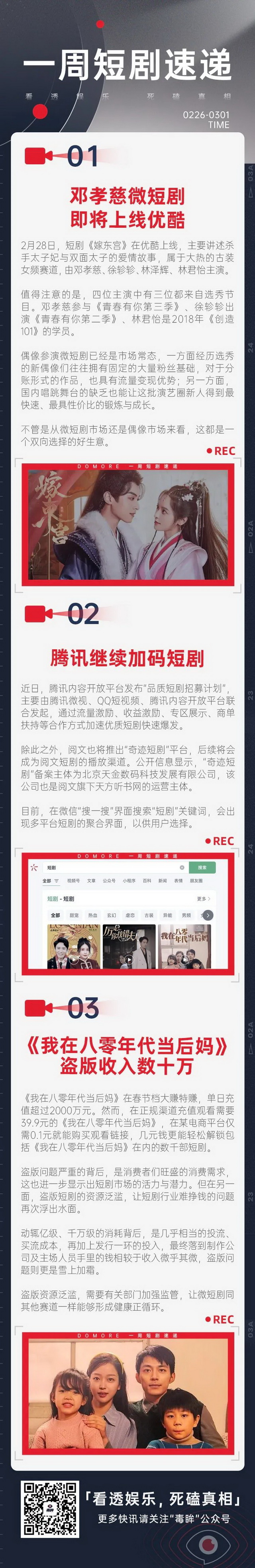 平台动作仍在继续。腾讯微视联合QQ短视频、腾讯内容开放平台发起“品质短剧招募计划”,另一腾讯系当家产品阅文也将推出“奇迹短剧”平台,微信出现短剧专属分区;优酷则持续上新微短剧,其中《嫁东宫》由多位偶像主演,继续偶像出演微短剧热潮。