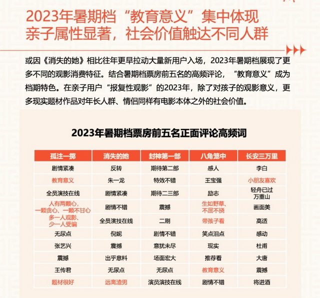 在灯塔研究院的《2023中国电影市场年度盘点报告》中,对暑期档提炼出的关键词是“教育意义”,包括但不限于反诈教育、反恋爱脑教育、古代诗词教育等。