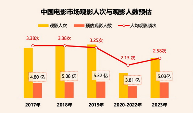 据灯塔报告,2023年,预估观影人数达到5.03亿,已经接近2018年的水平,但票房却还有高达60亿的差值。这差出来的60亿,全部都是由重复观影所带来的。2023年的人均观影频次为2.58次,仍远不及疫情前水平,有51%的观众一年只看一部电影。