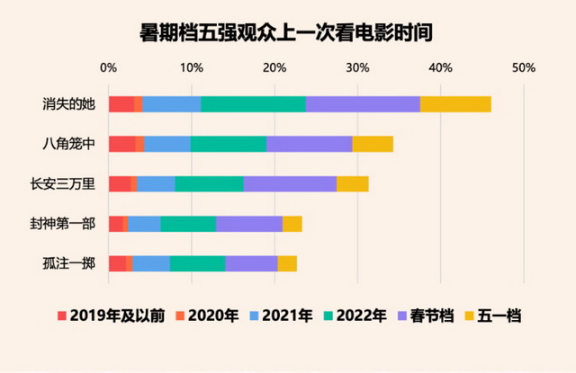 暑期档井喷的“实用主义”营销,恰恰将相当一部分低频观影用户带进了影院。根据灯塔报告,《消失的她》购票观众中约24%上一次看电影是2022年,约3%的观众上一次看电影是2019年及以前。