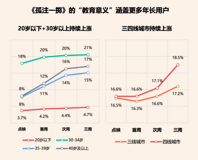 在《孤注一掷》身上,随着上映时间的后移,年长观众和三四线城市观众占比也逐渐提升。