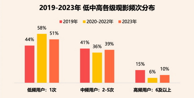 高频观众的大量损失同样是一个难题。2019年时,一年看6部及以上影片的观众还有15%的比例,疫情三年中直接降至6%,到2023年也只恢复到了10%的水平。这意味着,在国内一部投资体量不小的商业片,几乎注定必须吸引低频观众进入影院才能保证盈利,只针对高频观众口味的营销方式,根本不足以支撑影片回本。