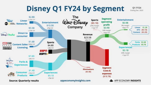 另外Disney+Hotstar终于止住下行趋势,从前一季的3760万微涨至3830万,再加上Hulu按季新增120万用户,让迪士尼的流媒体整体维持平盘。这也体现在直接面向消费者板块的财务指标上:该季度总营收从48.22亿升至55.46亿美元,同比涨幅达到15%;亏损额则从9.84亿压缩至1.38亿美元,优化幅度更接近86%。若与前个季度相比,该板块的净亏损便减少了近3亿美元,向2024财年内盈利的目标又迈进一大步。