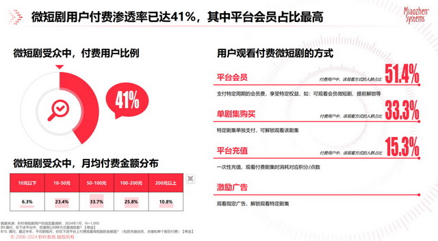 《中国微短剧市场发展研究报告》显示,微短剧的用户付费渗透率已高达41%,超过35%的用户,每月在微短剧上的付费流水甚至超过100元。