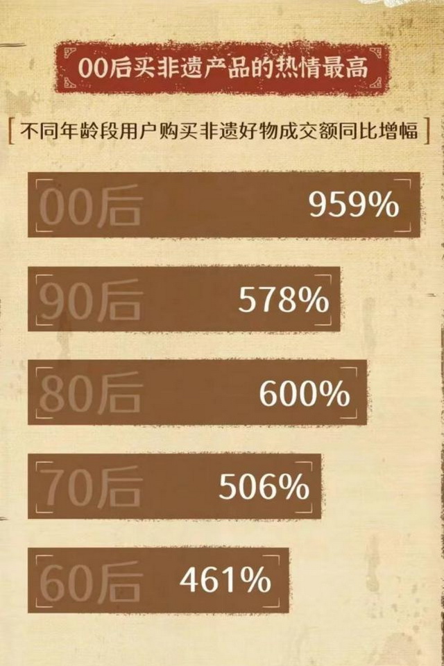 不仅爱看,“00后”还用真金白银表达自己对传统文化的热爱。根据《抖音2024非遗数据报告》显示,00后在购买非遗产品方面的增幅最高,达到了惊人的959%。