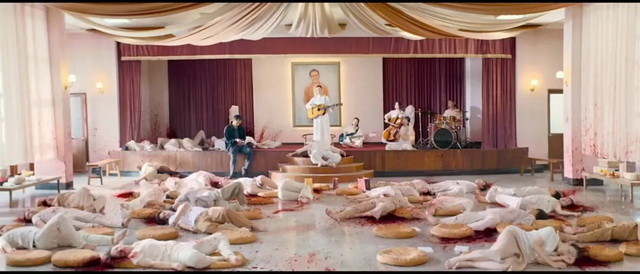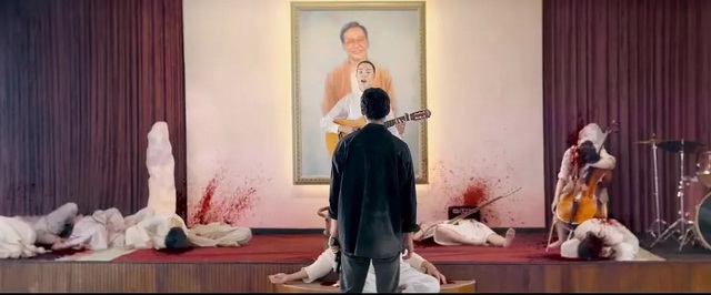 下一秒,子弹上膛,枪响打破寂静,高坐圣坛的尊者被一枪爆头,灵修堂变成屠杀现场。背景音乐却是“一起飞翔,新造的人”,颇有种安魂曲的惊悚蒙太奇感。