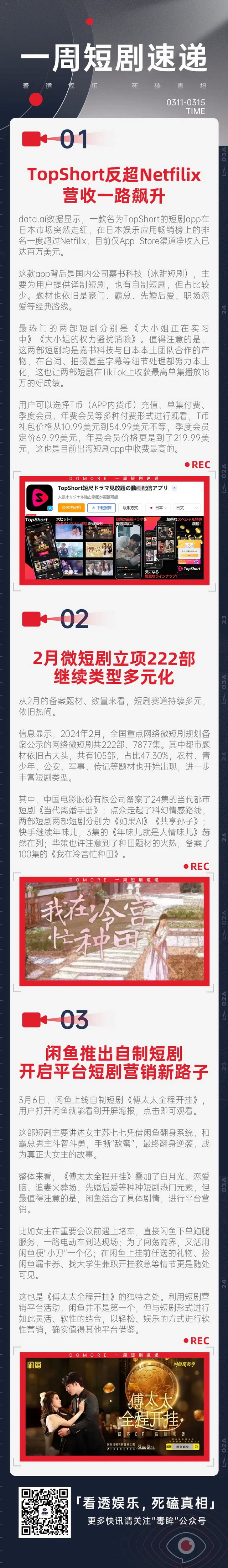 国内也同样热闹,2月备案短剧达222部,中影进军当代都市题材,备案24集短剧《当代离婚手册》。此外,农村、青少年、公安、军事、传记等题材也开始出现,进一步丰富短剧类型。