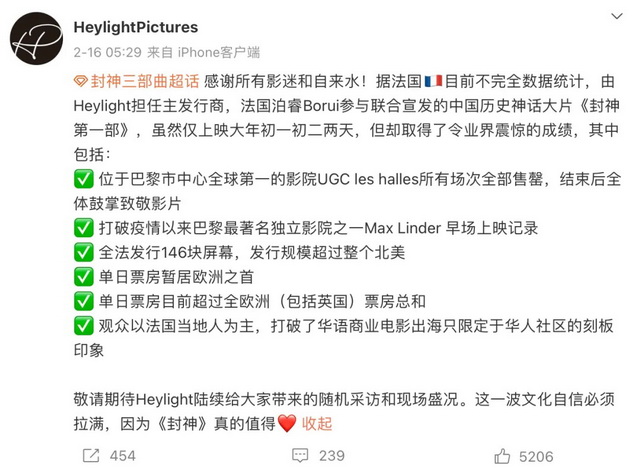 《封神》法国成绩(图源:微博)