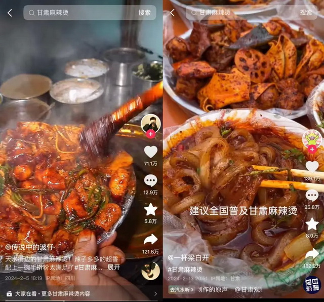 最初是在2月5日,抖音美食博主“传说中的波仔”发布了“天水街边的甘肃麻辣烫”视频,里面要冲出屏幕的香气,吸引了大量网友的好奇和关注;接着是在2月13日,生活类博主“一杯梁白开”发布“建议全国普及甘肃麻辣烫”视频,一呼百应,将天水麻辣烫的热度再推高一层。