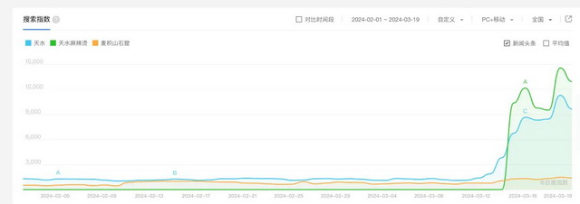 各垂类平台同样有鲜明迹象:大众点评、美团数据显示,进入3月,当前当地麻辣烫的订单量较前两个月同期增长超140%;移动通信用户出行大数据显示,3月上半月,仅热门区域“天水四合院”日均人次即达2.43万,峰值则直冲4.51万;同程旅行平台数据显示,截至3月14日,天水近一周的旅游搜索指数上涨186%,并呈现持续快速上涨趋势。