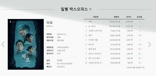 据统计,《破墓》首周末便吸引近2百万观众购票,不仅无悬念创下年度开画纪录,也改写导演张宰贤职业生涯新高。公映迄今,《破墓》总票房收入已突破9百亿韩元,即将成为今年首部破千万人次的电影。