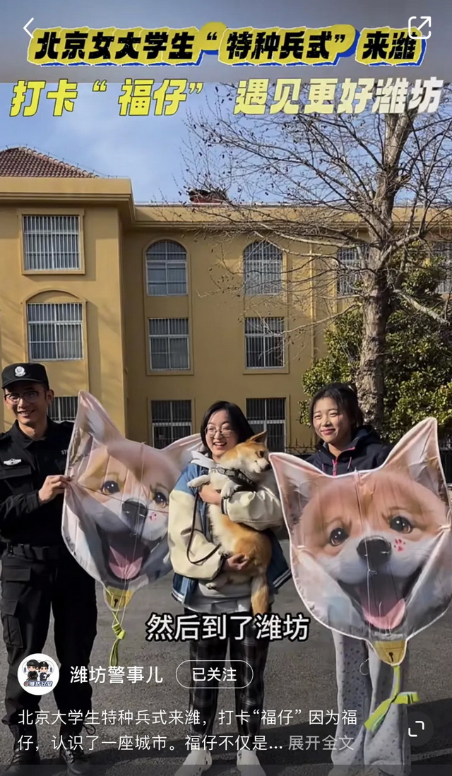 潍坊的警犬福仔可谓是当地文旅的意外之喜。作为全国唯一一只柯基警犬,“福仔”亮相于3月中旬的潍坊警营开放日,随即吸引到大批粉丝,甚至被海外媒体报道。