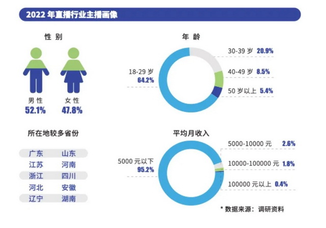 根据中国演出行业协会等联合编制的《中国网络表演(直播与短视频)行业发展报告(2022-2023)》显示,截至2022年末,以直播为主要收入来源的主播中,95.2%月收入5000元以下,仅0.4%的主播月收入为10万元以上。金字塔的塔底有十分广袤而沉默的基座。