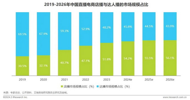 据艾瑞咨询《2023年中国直播电商行业研究报告》显示,2023年品牌店播的市场规模首次超过达播,占比达到了51.8%,在过去四年里增长近20%。