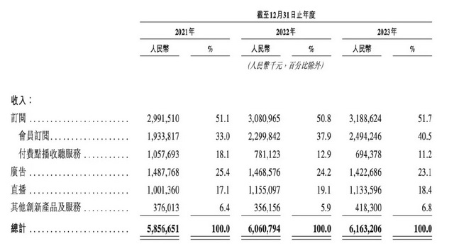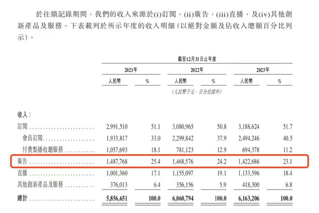 除了订阅之外,喜马拉雅的第二大营收就是靠广告了。招股书显示,2021年-2023年,喜马拉雅广告收入分别为14.88亿元、14.69亿元和14.23亿元,占总收入的比例分别为25.4%、24.2%及23.1%。广告收入以及所占总收入的比重都呈现下降趋势,以目前国内广告行业品牌商预算有限的大环境来看,未来广告收入的继续增长似乎并不算乐观。