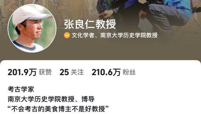 这位教授名为张良仁,来自南京大学考古文物系。视频里,他经常带着标志性的棒球帽行走在大街小巷,一边探店品尝美食,一边以美食探店为切入口讲述考古文化知识,以轻松且具有反差萌的风格获得了大批年轻网友的喜爱,被网友们评为“更适合中国宝宝体质的《孤独的美食家》”,也被抖音评为“稀缺优质知识创作者”。截止发稿前,张教授的账号粉丝已突破200万,视频最高点赞量突破10万。