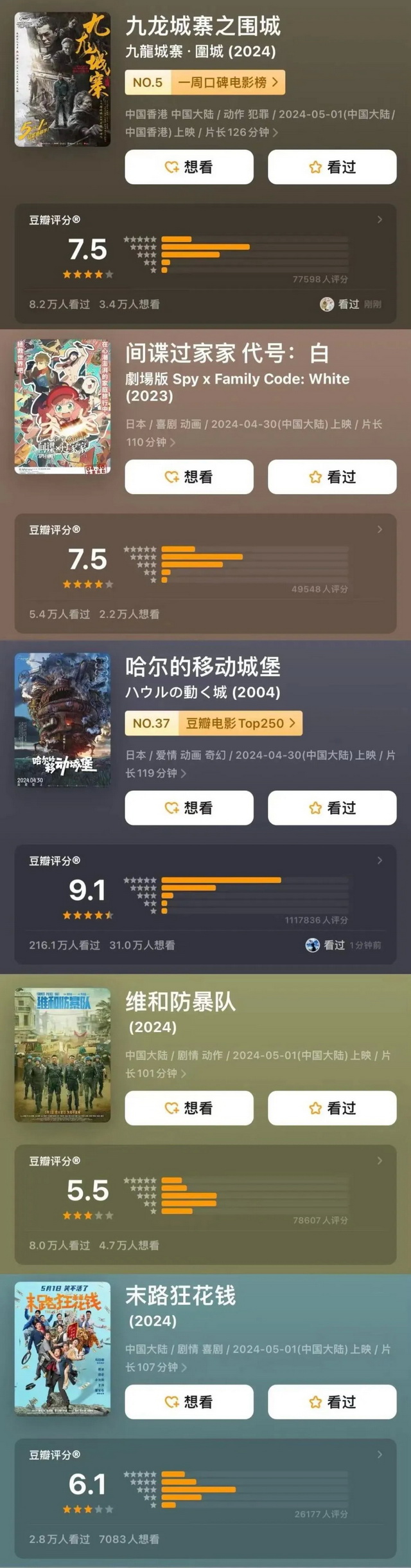 比起票房,影片在口碑上的两极分化要更加严重。《九龙城寨》《间谍过家家》豆瓣评分7.5,重映片《哈尔的移动城堡》更是有9.1分;而位于头部梯队的《维和防暴队》《末路狂花钱》则分别仅有5.5分和6.1分,档期内垫底。和去年五一的情况相比,头部梯队同样是主旋律+喜剧的组合,《长空之王》《人生路不熟》在档期刚结束时豆瓣评分还有6.8分和6.6分,不过,去年五一档也没有超过7.1分的影片(点此阅读:五一档没一个能打的)。