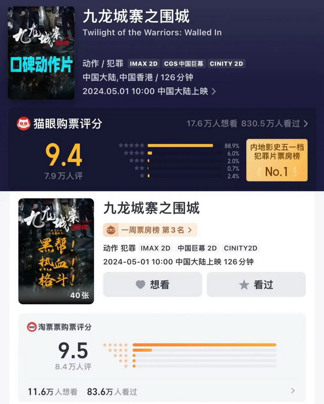 即便结合猫淘评分,同样是《九龙城寨》更高,双平台高达9.4和9.5分,而头两名的影片仅在9分左右徘徊。