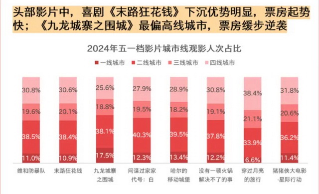 另一重原因是,如今电影市场的档期观影越来越依赖下沉市场的消费能力,而对下沉市场观众来说,口碑的不可见度更高。据猫眼《2024五一档数据洞察》,《维和防暴队》和《末路狂花钱》的下沉市场观影人次占比显著高于同档期大部分影片,而《九龙城寨》则明显更受一线城市观众欢迎。