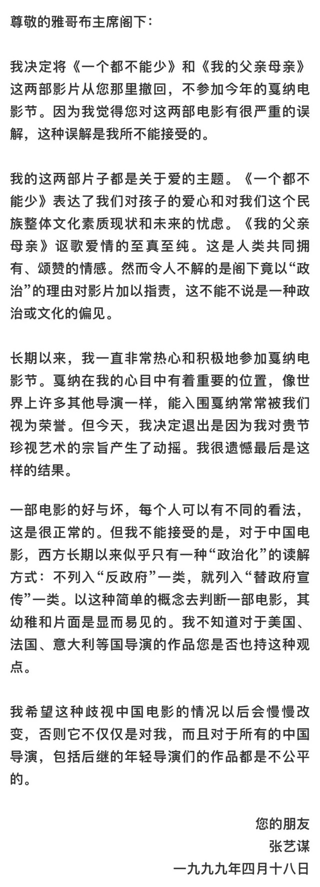 但世事不会总一帆风顺,下坡的转折点总在不经意间来到。1999年,戛纳主席吉尔·雅各布认为张艺谋的《一个都不能少》有“政治意味”,希望张艺谋用《我的父亲母亲》代替《一个都不能少》,张艺谋给雅各布留下一封公开信,愤而决定两部电影同时退出戛纳。