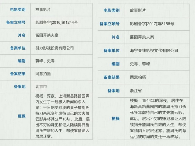 电影第一次备案是在2016年,彼时这个项目还叫《酱园弄杀夫案》。2017年,该项目又进行了一次备案,影片梗概有了微调,删去了“将丈夫分尸16块”,加上了“詹周氏的命运也被时局的变迁一再改写”。这从某个侧面反映了电影剧本的侧重点发生了变化。