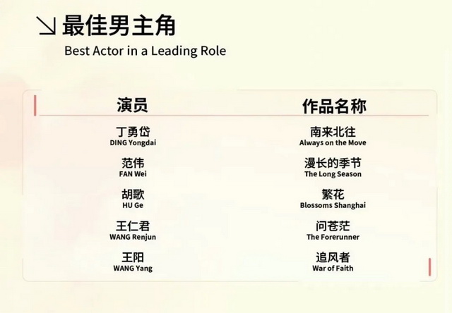 第29届白玉兰奖最佳男主角入围名单(图源:微博)