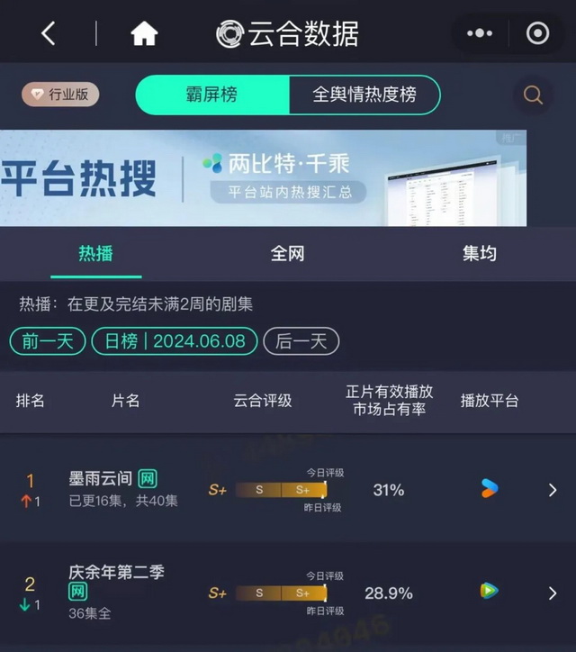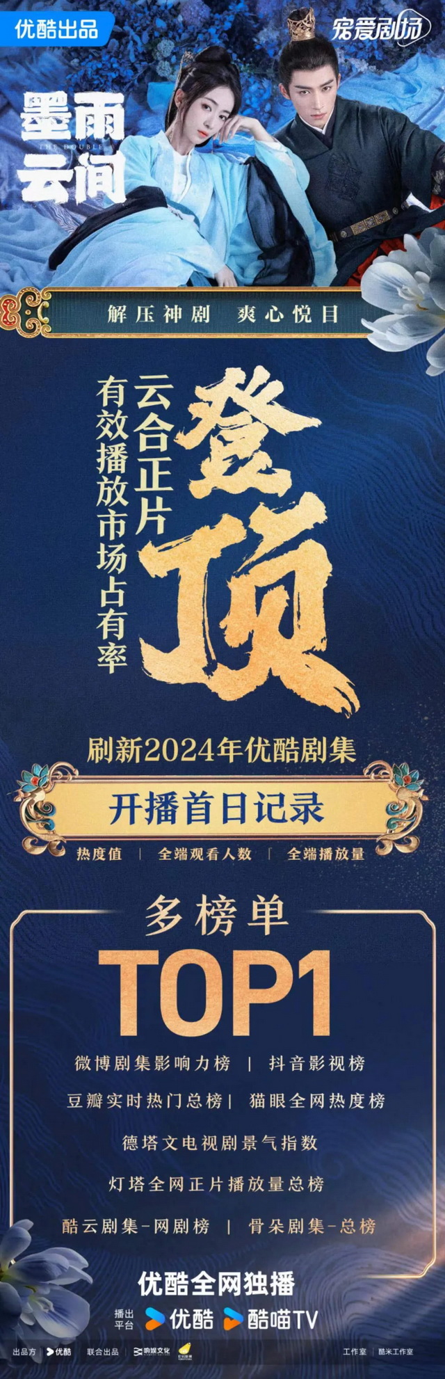 数据上的成绩,更能验证《墨雨云间》的市场热度。剧集开播两天热度破万,成为优酷今年破万最快的剧集;云合数据显示,6月8日最高市占率达31%,相较开播时的8.5%,实现了近四倍的跃升,且仍保留着上涨趋势;灯塔数据显示,开播首日正片播放量超过《庆余年2》,成为2024年开播首日热度最高剧集。