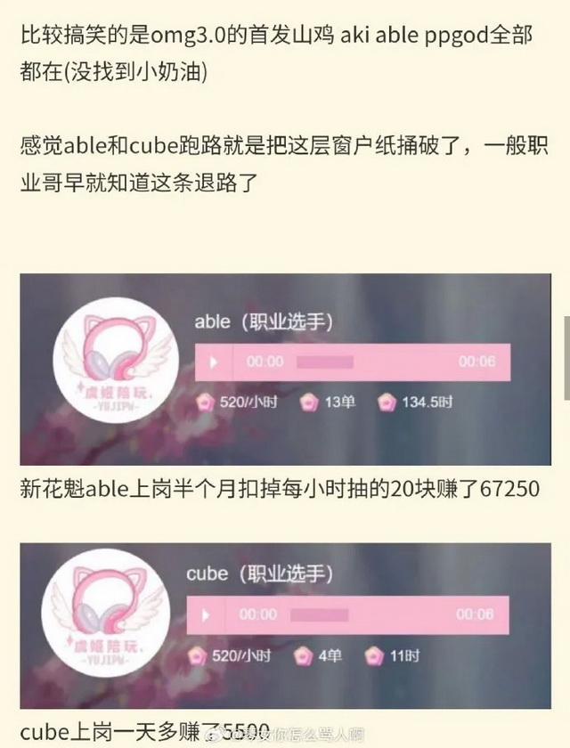 至于陪玩的工资呢?多数主播在直播间爆料的,都是“能拿10万一个月”。有网友黑进了小虞姬陪玩店(也是此次引发讨论的OMG前AD Able和前上单CUBE就职的地方)的官网,发现Able和Cube的标价都是520元一小时,而Able上岗半个月,去掉抽成,赚了67250元,Cube上岗一天多,赚了5500元。
