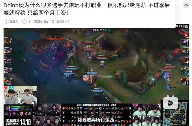 “其实现在比LPL目前在场的选手打得好的人有很多,但是现在选手的工资……没办法,他们要打职业的话真的是全部为了追求梦想,要放弃太多了。”Doinb在直播中说。