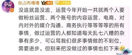 今年6月,BLG官方运营号@BLG布噜噜 因被发现关注了杨紫、肖战超话而被粉丝围攻,在回应时,工作人员表示两个人要承担粉丝运营、媒介沟通、商务执行等复杂的事物。