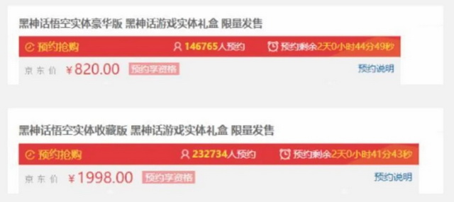 在数字版之外,实体豪华版售价820元,包括了游戏兑换码、收藏铁盒以及黄铜紧箍等游戏周边,实体收藏版则售价1998元,在实体豪华版的基础上额外包含了“天命人”手办和其他周边产品。据分析机构数据显示,《黑神话:悟空》预购三天销售额就已破亿。