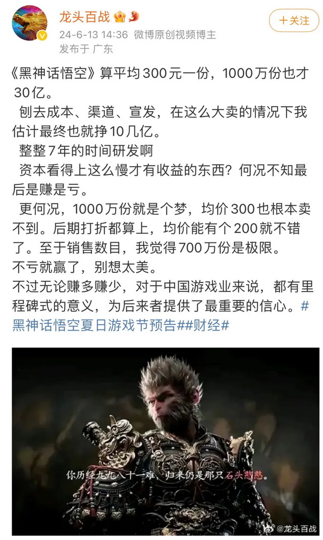 同时,很多对于《黑神话:悟空》定价的批评,也要归因于这款游戏的破圈。很多玩家此前并不了解买断制游戏、长期都是手游甚至是页游的玩家对其产生了兴趣,当价格与他们的习惯认知不符的时候难免困惑甚至于泛起批评的声音。