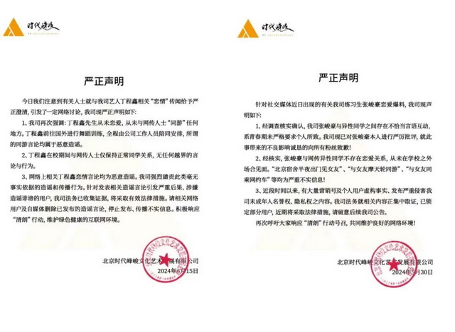 最近一个月,时代峰峻通过@峰峻文化、@TF家族 官微连发4份公司声明,2份律师声明,对旗下时代少年团成员丁程鑫的恋情传闻、TF三代练习生张峻豪与女生“不恰当言语互动”、TF四代练习生王浩私联站姐等事件作出回应。除此之外,还有8位练习生因各种负面传闻发布了手写道歉信。