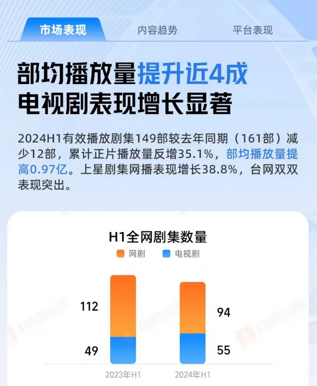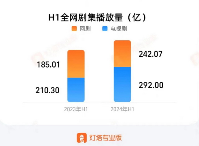 根据灯塔《2024H1剧集市场洞察报告》显示,虽然今年头部项目播放量低于去年的“剧王”《狂飙》,但排在前五的剧集总播放量却高于去年,超过了100亿。