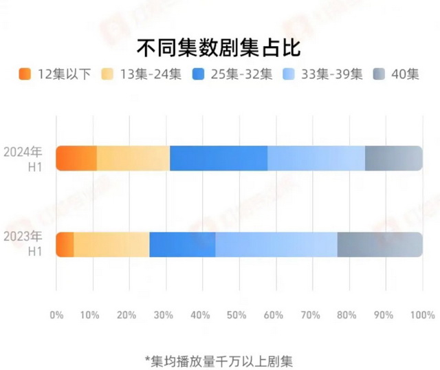 从数据上,能更直观地看出“长剧向短”的趋势。上半年中,12集以下剧集占比超10%,较同期占比翻倍,25-32集剧集占比提升8.7%,33集以上剧集整体占比减少14.2%。