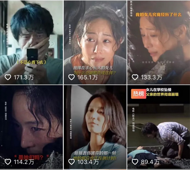 《默杀》找到了这个点。在《默杀》的官方抖音账号数据最好的前五条视频里,有四条都是影片开篇女孩被霸凌用胶水粘在墙上的段落。虽然这些片段的过度泛滥,也已经招致不少网友批评,但从效果而言,的确吸引到了不少观众对它的注意。