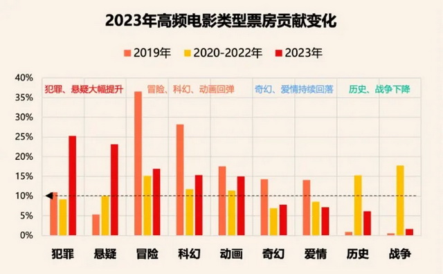 从去年开始,悬疑犯罪类影片迎来井喷,大盘贡献也大有提升,证明了这一类型拥有强劲的市场潜力。据灯塔《2023中国电影市场年度盘点报告》显示,犯罪类型、悬疑类型,是从2019年-2023年间票房贡献度增长最大的类型。