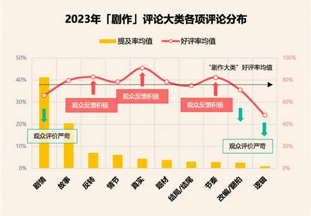 首先是逻辑,中国观众尤其在意电影的逻辑,某种程度上这也是悬疑犯罪电影受欢迎的原因之一。报告显示,2023年关于“剧作”的评论中,观众对于逻辑方面的评价最为严苛,也是好评率最低的一个维度。换言之,只要一部悬疑犯罪片,在逻辑上做到很难被挑出错,那么它就能在普通观众中拥有相当不错的“口碑”。