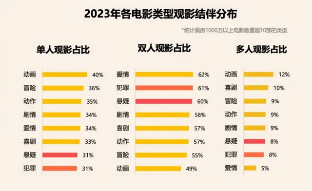 在悬疑犯罪片中,工具价值是什么呢?一则非常有趣的数据是,在2023年各电影类型观影结伴分布中,悬疑犯罪片在单人和多人观影占比中均处于低位,只有在双人观影占比中排名前列。