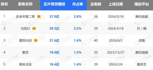 云合数据显示,《庆余年第二季》在2024H1以累计正片有效播放37.9亿实现领跑,《与凤行》和《墨雨云间》则分别位居2024上半年全网剧集有效播放霸屏榜第二、三位。