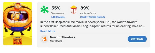 从口碑来看,《神偷奶爸4》的烂番茄新鲜度只有55%,影评人表示其“节奏明快,充满了闹剧式的笑料”,虽然内容填塞显得过满,但也足够让观众享受看电影的快感;同时《神偷奶爸4》的爆米花指数达到89%,足见粉丝对这部新作仍相当满意。作为对比,《神偷奶爸3》的两项指标分别为58%和53%,该系列在媒体风评上继续探底。