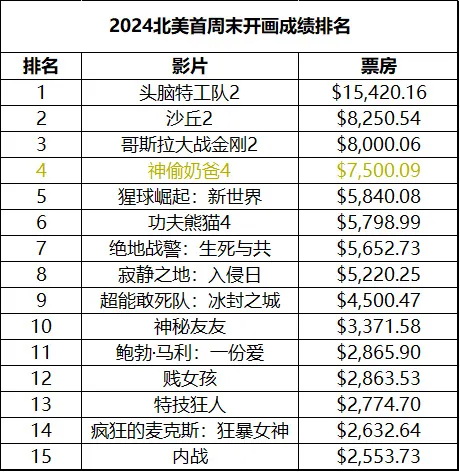 这一数字低于2013年的《神偷奶爸2》(3501万美元),后者同样在星期三亮相。紧接着《神偷奶爸4》在“独立日”拿到2040万美元,前两天已迫近5千万线。自5号后《神偷奶爸4》再扩大至4428家影院,首周末报收于7501万美元,单馆收益达到1.69万美元,取代《头脑特工队2》夺魁。