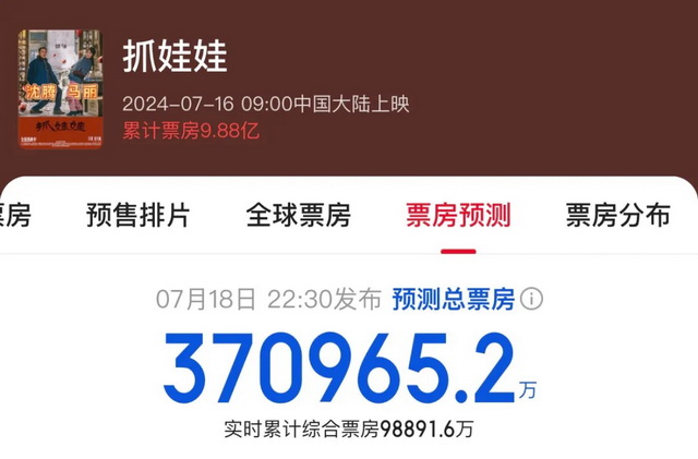 盼望着盼望着,惨淡的暑期档终于等到了“救世主”。截止7月19日凌晨,电影《抓娃娃》的累计票房已经超过9亿人民币,沈马组合再度合体便出手不凡,猫眼预测其总票房超过37亿,已是争夺年度票房冠军的种子选手。