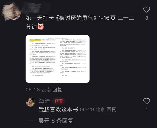 跟随号召,粉丝们纷纷开始晒起了自己的“读书打卡照”,一位网友晒出自己阅读《被讨厌的勇气》的图片,海陆回复,“我超喜欢这本书”。