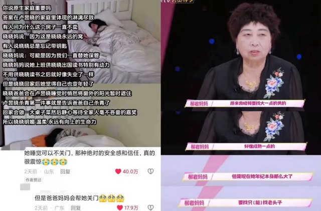 尤其在同档节目中,另一位明星于文文的母女关系亲密又疏离,柳岩则是被亲生母亲说“剩女”“要找只能找老头子”“懒懒散散,女孩子一点都不文雅”,卢昱晓温暖、和谐的家庭氛围在对比之下,显得愈发可贵,也引发了观众们最新一波关于原生家庭的讨论。